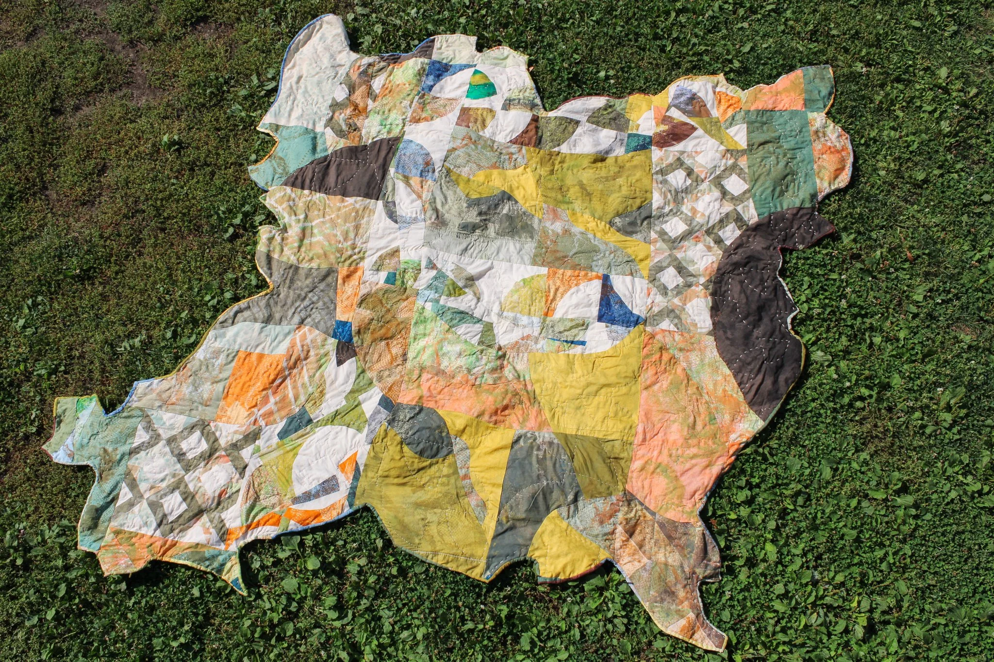 A Reminder That I Love You (front) Dedicated to my childhood dog Luke. April 2, 2011 - November 26, 2023. 2024, machine-sewn quilt, hand-sewn applique, hand-sewn embroidery embedded with memories of Luke and home, felt from my first quilt of Luke, fabric from Luke’s bed, naturally and chemically dyed fabric, ice-dyed fabric made in the backyard of my childhood home, fabric from my grandma and my stash, Luke’s blue paw print blanket as batting, 63”x72”