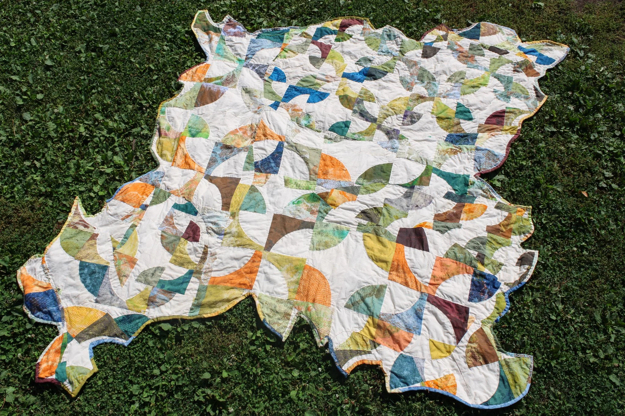 caught in the net of life approximately 75”x80” 2025 cotton fabric, thrifted pillowcases and sheets, mx dye, collected grocery store nets, cotton batting, hand-dyed, machine-pieced, hand-sewn quilt